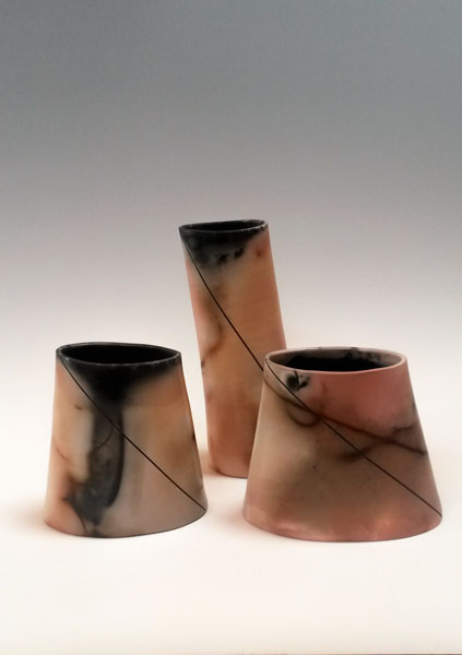 My work consists of traditional shapes presented in a contemporary style. I throw all my work but very often alter the pieces. I am mainly interested in form as opposed to function. The refined finish that can be achieved by turning and burnishing is a perfect vehicle for the effects of primitive firings that reacts to fire and heat on the bare clay surface